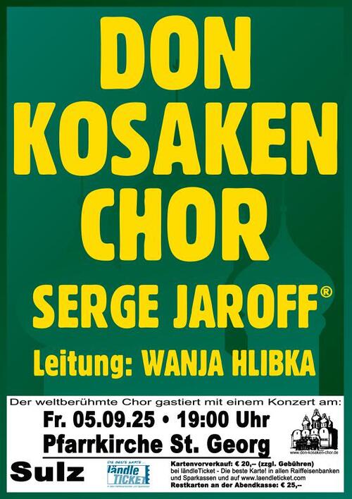 Don Kosaken Chor Serge Jaroff - festliches Kirchenkonzert in Sulz am 5. September 2025 FESTLICHES KIRCHENKONZERT 2025 DON KOSAKEN CHOR SERGE JAROFF ® Freitag, den 5. September 2025 - 19 Uhr in unserer... Mehr lesen